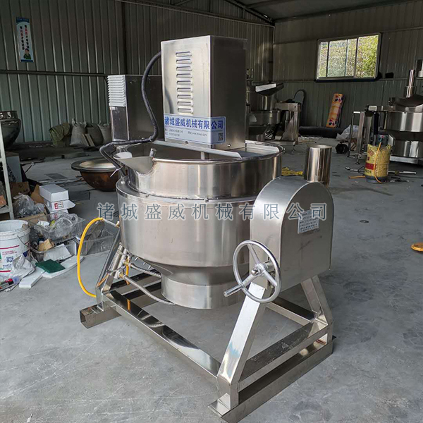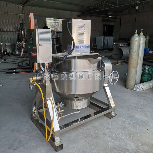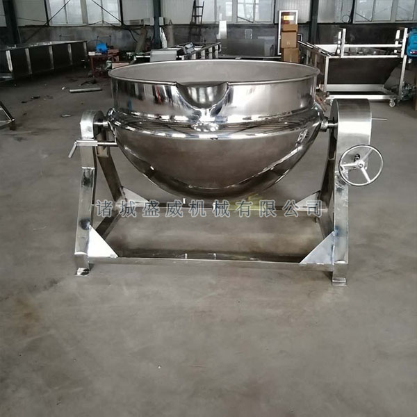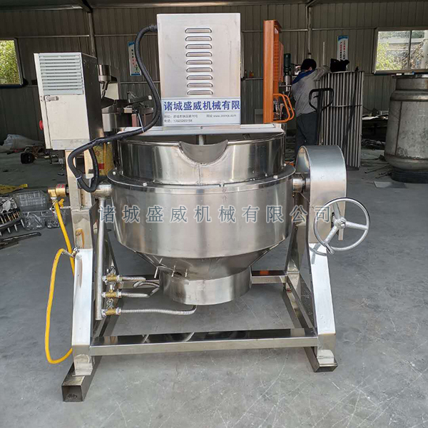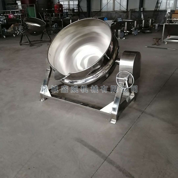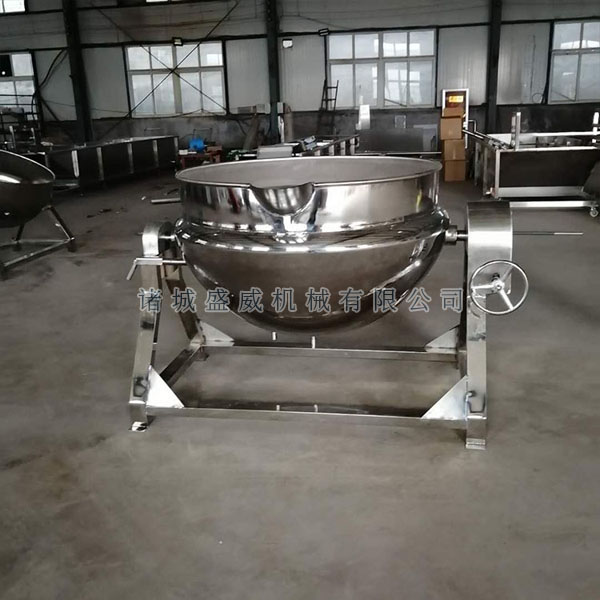 3、燃气加热夹层锅:该设备主要由锅体、底座、燃具及倾锅装置等部分组成。打开气阀,点燃燃气,人工加入食用油待油温达到烹饪温度时,加入适量的物料,人工翻锅、搅拌,使物料在锅里均匀受热。待物料加工完毕后,关气熄火转动手柄,通过蜗轮、蜗杆传动装置,使锅体旋转倾斜,将物料倒入另一容器内