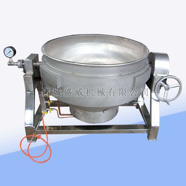 3.燃气加热夹层锅:该设备主要由锅体、底座、燃具及倾锅装置等部分组成。打开气阀,点燃燃气,人工加入食用油待油温达到烹饪温度时,加入适量的物料,人工翻锅、搅拌,使物料在锅里均匀受热。待物料加工完毕后,关气熄火转动手柄,通过蜗轮、蜗杆传动装置,使锅体旋转倾斜,将物料倒入另一容器内。