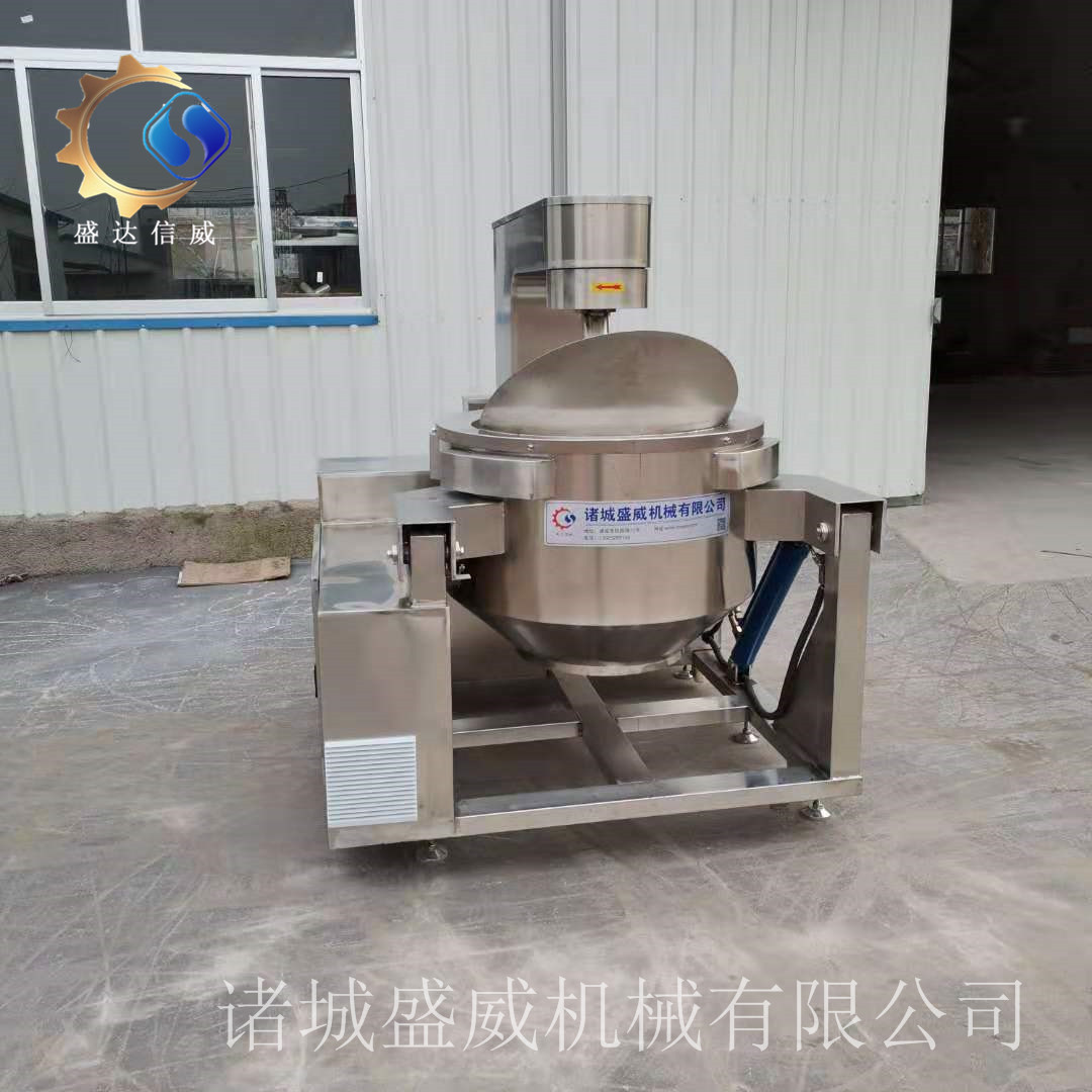 该设备主要由锅体、架体、搅拌系统、加热系统、调速传动装置、搅拌轴、锅体翻转系统等组成,采用一次冲压成型的半球形不锈钢锅体,采用蒸汽、液化气、天然气等加热形式,搅拌方式采用特殊的倾斜式传动,使用的行星式搅拌器与锅体充分接触,实现传动公转与自转的不整数传动比,使锅内无搅拌死角。使用先进的传动与密封结构,使传动部分与锅内洁净、卫生。采用变频调速动力,运行更平稳。采用液压升降,翻锅运料,免拆装搅拌器,节省人力,降低劳动强度,是性能优良的食品加工设备。