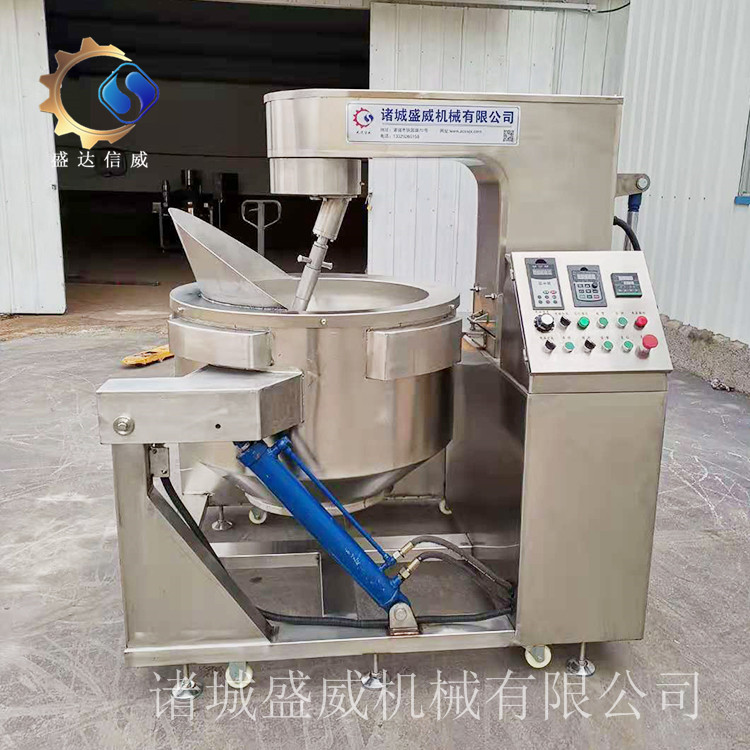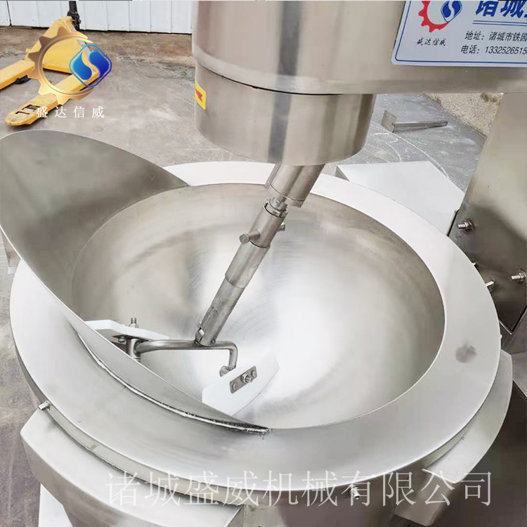 本机吸收借鉴国际先进技术,结合众多食品厂家的专家建议,自主研发的一种新型双向刮底搅拌夹层锅,本锅体搅拌部分采用一次性成型的不锈钢锅体,保证了锅体的平衡光滑,采用蒸汽、液化气、天然气等加热方式,刮边采用弹簧式,刮底采用自重式,使锅体与搅拌叶片紧密接触,使物料搅拌均匀,不粘锅,动力采用日本无机调速器与涡轮、蜗杆,减速机的完美结合,传动部分公转自转的不整数传动比,使锅内搅拌无死角,使用先进的传动与密封结构,使传动部位与锅内洁净、卫生,本机采用液压式翻臂,翻锅出料,省力、省时、省工、不失为性能优良的生产设备。