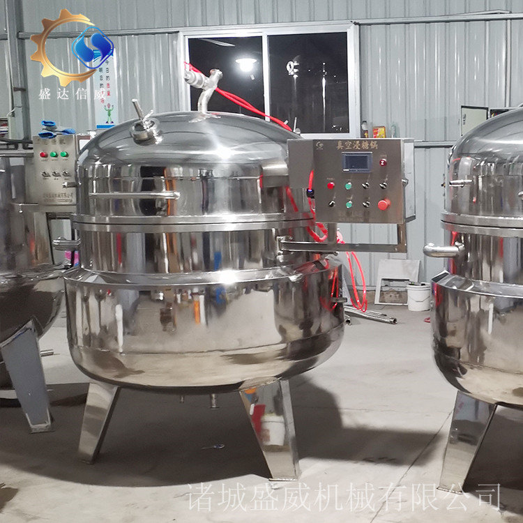 真空浸糖锅又名真空糖渍锅,适用于各种蜜饯、水果浸糖、酱菜迅速腌渍。如:红薯、大枣、蜜枣、山楂、蓝莓、草莓、苹果、梨、桃子等迅速浸糖,酱菜及休闲食品调料迅速腌渍入味,根据产量可配套抽空罐规格,罐体可以加装加温夹层,可安装温度自控系统;可配套气动开盖装置。真空浸糖锅以有压力的蒸汽为热源,真空浸糖锅具有受热面积大、热效率高、加热均匀、沸腾时间短、加热温度容易控制、方便清洗、真空度高等特点。