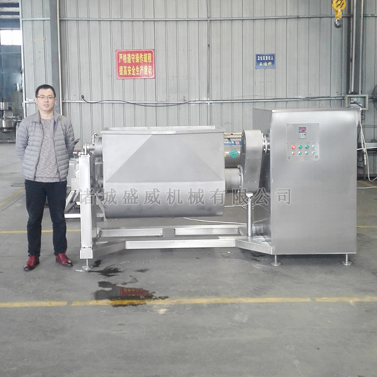 横轴搅拌炒锅的U形锅体顶部抽真空,夹套采用蒸汽加热,无段变速与蜗轮、减速机的组合传动,增大了横轴搅拌的办矩,采用聚四氟乙烯材质刮板的搅拌器,在物料的翻滚搅拌过程中,搅拌器与锅体的全方位充分接触,确保了无搅拌死角。锅体的开盖、卸料、复位采用液压、机械传动控制,操作极为方便。真空炒制可降低炒制温度,特别适应于热敏原料的炒制,避免了因过度受热引起颜色及口味的劣化,保持了原料原有的色、香、味。提高了炒制效率,并降低了能耗,缩短了炒制时间。